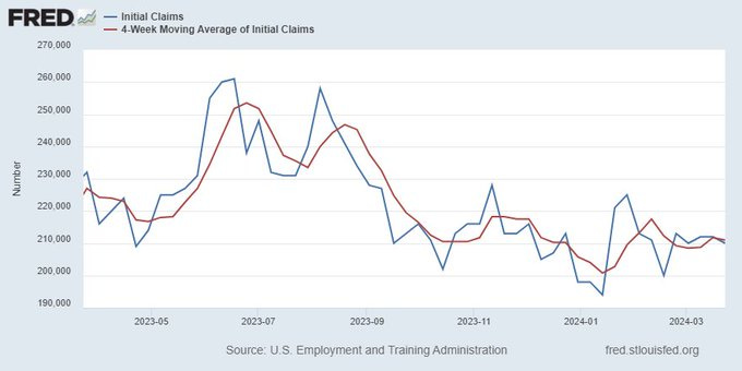 With an eye toward the labor market, you’ll see on the chart below that we have been holding steady in terms of the four-week moving average of Initial Jobless Claims.